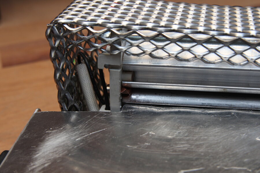 Wegen der etwas warm werdenden Aluteile kam noch ein Gitter oben drüber. Ist zwar trotzdem sehr warm dort, aber es riecht dann nicht so nach Hähnchen.