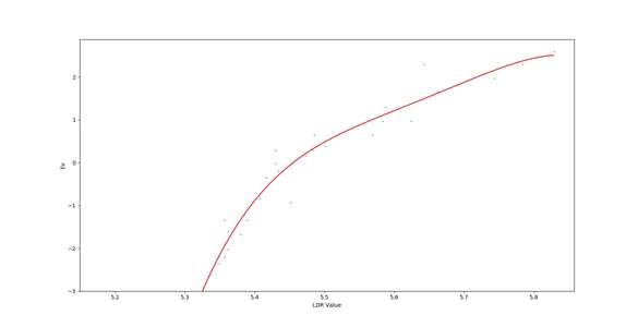 Mithilfe eines Python Programms versuchte ich durch Least Squares Optimierung eine Polynomkurve zu bestimmen mit einem möglichst geringen Polynomgrad, da sonst die Rundungsfehler im STM zu groß werden können.