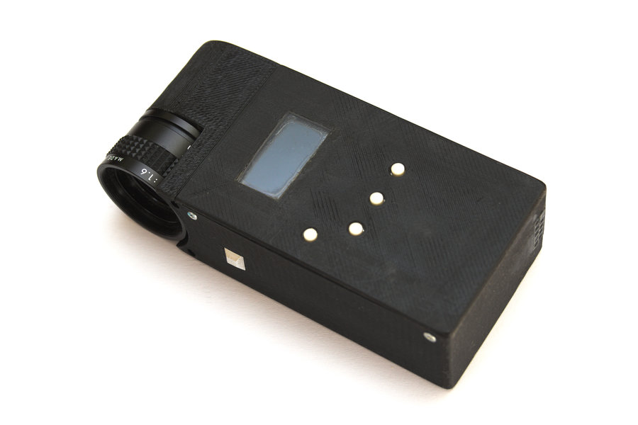 Und fertig ist der DIY Spotbelichtungsmesser. Durch zwei Löcher unterhalb des Objektivs kann der zu messende Bereich angepeilt werden. Ein Druck auf den Auslöser speichert den aktuellen Lichtwert und zeigt ihn im Display an.