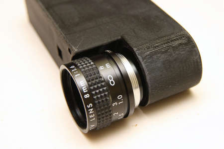 Das Objektiv kam von einer CCTV Überwachungskamera und hat eine Brennweite von 8mm und eine feste Blendenöffnung von f/1.6 ("Computar TV LENS 8mm 1:1.6").