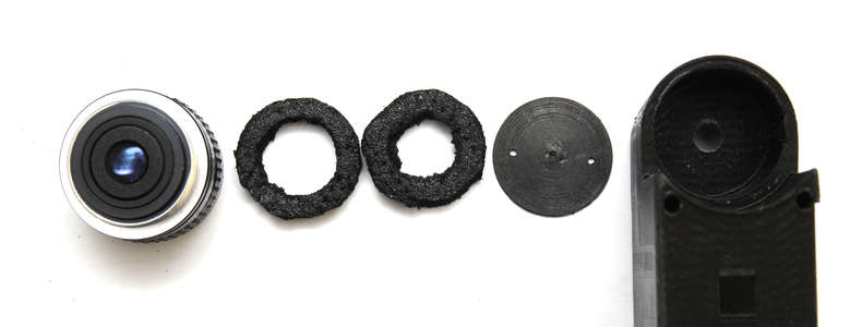 Das Objektiv hat ein Gewinde und wird nach Erwärmen des PLA Plastiks gerade in das Gehäuse geschraubt.