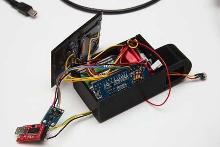 Dann musste alles in das Gehäuse gestopft werden. Unten kam noch eine 2x5 Buchsenleiste hin, welche zum Laden und Programmieren des Microcontrollers dient.