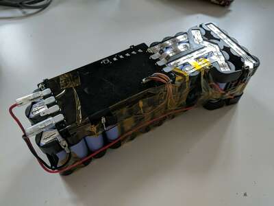 This is what is normally inside of a e-bike battery: 50x 18650 LiIon cells configured as 10S (=37V nominal voltage). On this one the bms probably went bad.