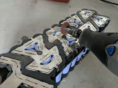 Taking them out of the enclosure was kinda difficult. The nickel strips which are welded to the battery terminals are really thick and needed to be ground off. Pulling them off would rip the whole cell apart.
