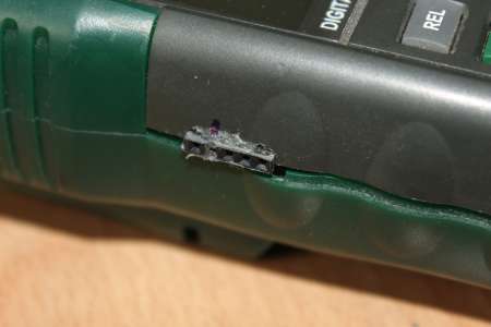 Ein 9 Poliger SUB-D Stecker war mir einfach zu Klobig, also hab ich dezend eine Buchsenleiste in der linken Seite des Gehäuses versenkt. Die beiden äußeren Kontakte sind die des "Schalters", welche bei Kurzschluss die RS232 Ausgabe des Multimeters aktivieren. Die mittleren drei Kontakte sind mit Masse (schwarz), VCC und Signal des Optokopplers verbunden.
