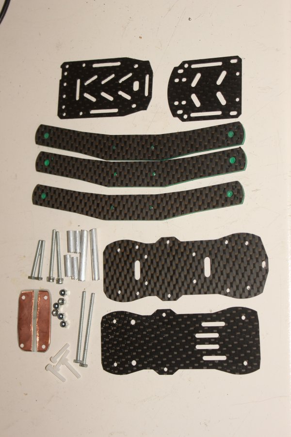 Die Arme (incl. einem als Ersatz) hab ich aus der CFK Sandwichplatte gefräst. Die anderen Teile aus 1.4mm bzw 0.8mm Carbon. Hier auch nochmal ein Dankeschön an Pascal fürs benutzen Dürfen seiner Fräse.
