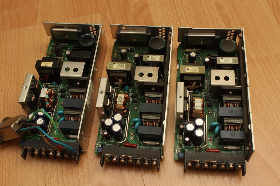 Fündig geworden bin ich in alten LAN-Switches, welche je ein 5V 20A Netzteil eingebaut hatten. Drei davon in Reihe machen 15V bei 20A, was exakt 300W ergibt.
