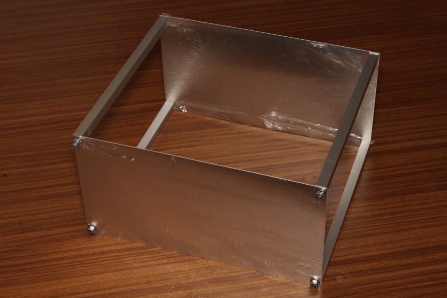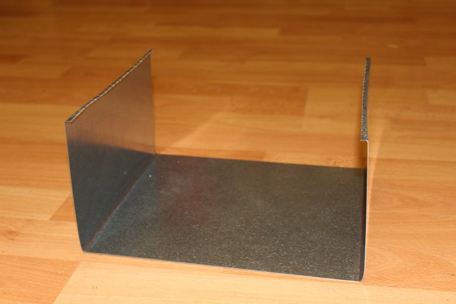 Um das Blech an den Seiten zu fixieren wird es nicht festgeschraubt, sondern durch zurechtgebogene L-Profile gehalten. Schwer zu beschreiben, eventuel sind die Bilder später eine bessere Beschreibung.
