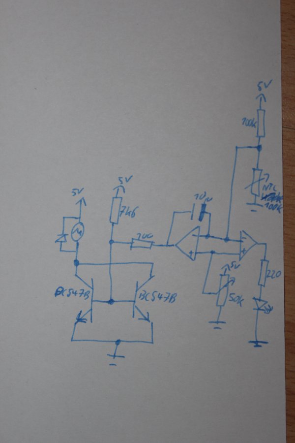 Da die zwei Lüfter auf Dauerbetrieb doch etwas laut sind, soll eine temperaturgesteuerte Lüfterregelung diese nur ab einer einstellbaren Schwelle einschalten, darunter drehen sie sich nur Langsam. Den Schaltplan dient nur der Vollständigkeit. Bitte nicht nachbauen, da er eher so "works for me" aufgebaut ist.