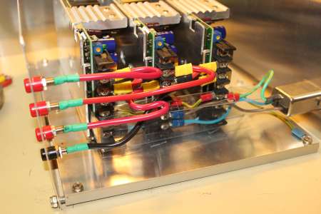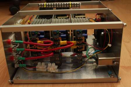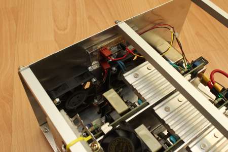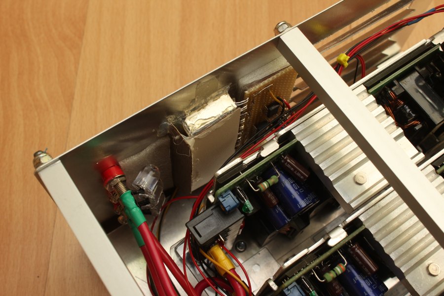 Die Erdung der Kaltgerätebuchse ist an alle Netzteile angeschraubt und zusätzlich an die Bodenplatte. Weiterhin hab ich ein reststück Plastikverpackung zurechtgebogen, als Abdeckung für die Netzspannung.