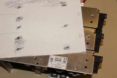Eines der Bleche bildet die Bodenplatte, auf welche die drei Netzteile geschraubt werden. Die Lochabstände hab ich durch durchdrücken auf ein aufgelegtes Papier ermittelt. Einscannen und ausdrucken ist ebenfalls ein guter Tipp.