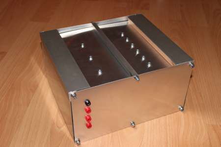 Auf der Vorderseite werden die 4mm Bananenbuchsen eingebaut. Insgesamt vier Stück, als Abgriff jeder Spannung. Also Masse, 5V, 10V, 15V.