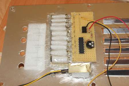 Für die paar Bauteile reicht locker ein stück Lochrasterplatine. Die LEDs strahlen seitlich in kleine aus dünnem Alublech zusammengeklebte Kammern hinter den gebohrten Zahlen. Der weiße Schaumstoff dient nur als Diffusor, um das Licht der Superhellen Weißen, Bernstein und Roten LEDs besser zu verteilen.