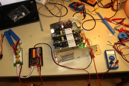 Um die Anzeige grob zu kalibrieren brauchte ich einen Verbraucher der auch die vollen 20A ausreizen kann. Also an den 300W Lipocharger zwei Lipos Parallel angestöppselt und zuerst mit etwa 8.5A geladen, das macht bei 10V Eingangsspannung am Lader 10A Strom. Mit einem Schraubenzieher am Poti zwischen Opamp und LM3916 kann dann herumgedreht werden, bis die richtige LED der Anzeige leuchtet.