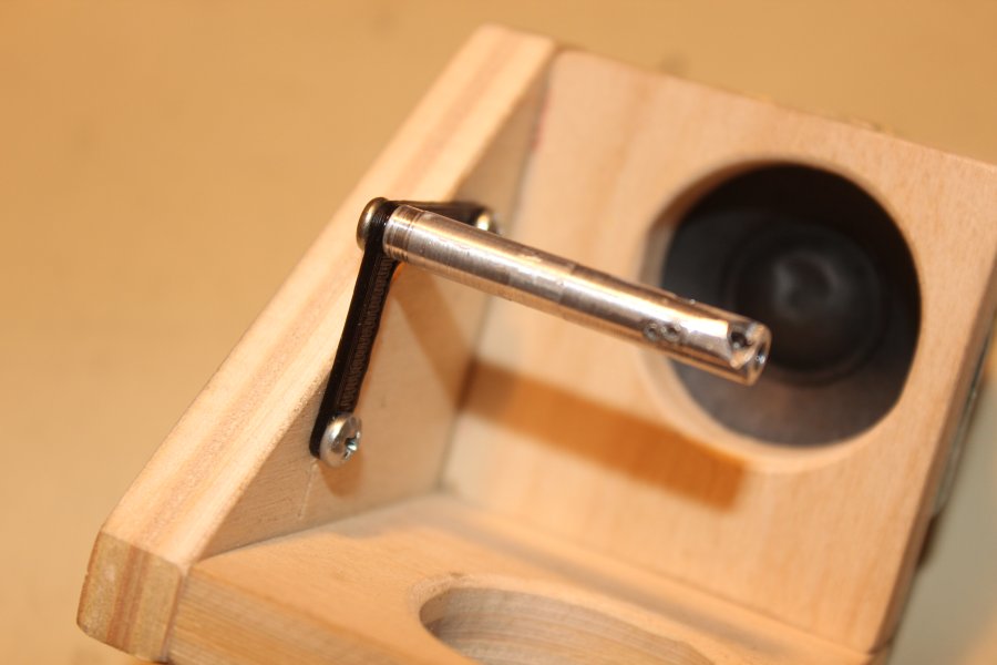 Also two 3D-printed cones are glued to the membranes of the speakers to transmit the vibrations to a short piece of brass rod. Two more brass rods (0.8mm) are glued to the aluminium rod 90° to each other and soldered to the other short brass pieces on the PLA cones. The speakers can later be disassembled by removing the solder, but it also are rigid enough to transmit the higher audio frequencies.