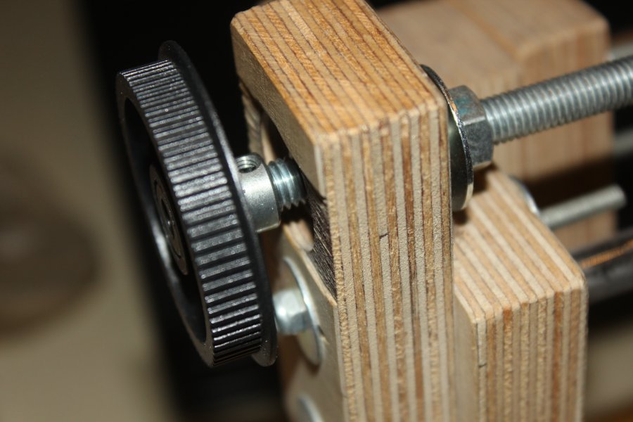 The stepper motor was salvaged from an old scanner. Because it has a gearbox already attached to it, it was ideal for such slow movements. However, the frequency of rotation needed for 8mm/min feedrate lies quite close to the resonance frequency of the plastic gears, which results in a nasty rattling noise.