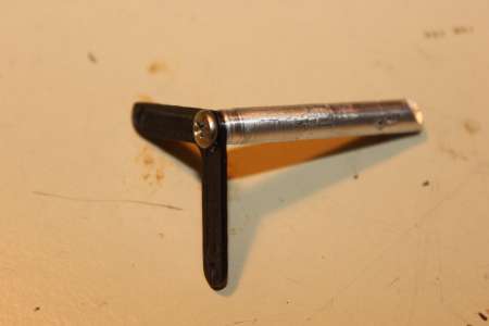 The needle (this one is 1.2mm thick filler material from TIG welding) is put through an angled hole in an aluminium rod and fixed by a thread screw from the front. A V-spring 3D-printed out of PLA holds the aluminium rod in place but allows it to move in the desired directions.