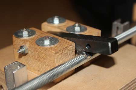 Until now the carriage was moved by a wooden block with a thread pressed in it. This was meant as a temporary solution and is now exchanged by a square steel rod with half of a nut welded to it. Both wooden block on the sides are still adjustable in distance and the backlash can thus be minimized.