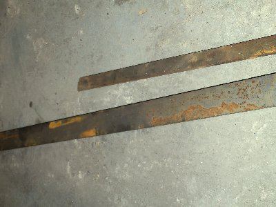 Hier die rostigen Stahlstangen vom Schrottplatz. Aus der oberen (2cm breit) entsteht die Kugellagerhalterung.