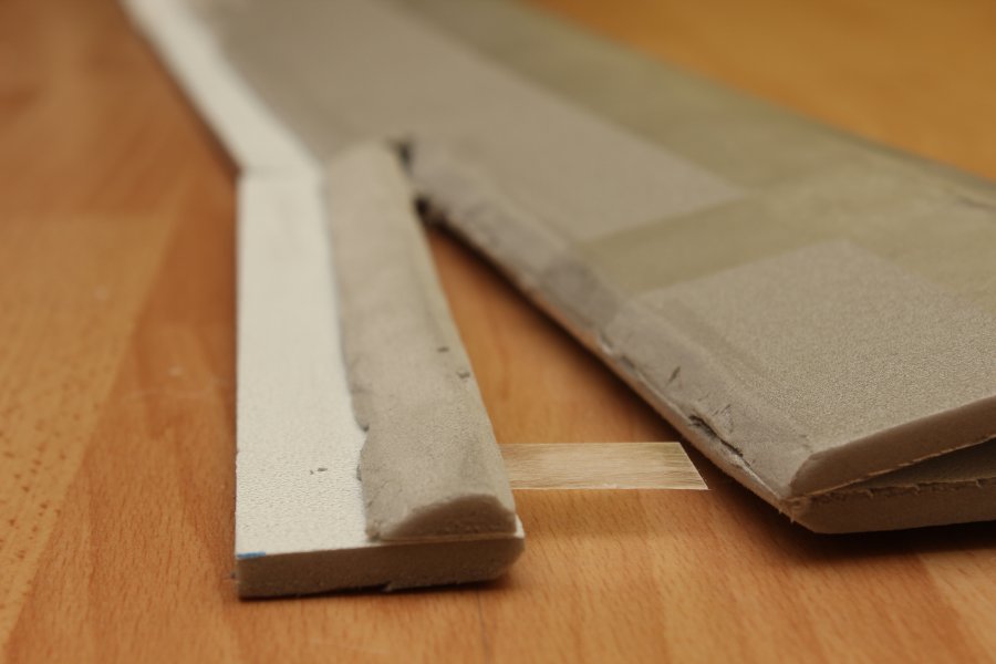 Wieder zuhause hab ich unter anderem die Profildicke der Tragflächen durch draufrumdrücken um ein paar Millimeter verringert. Ebenso die Vorderkante etwas abgerundet.