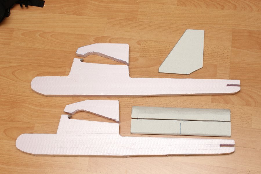 Die Tragfläche wird später auf den Rumpf gelegt und von oben durch eine Art Kappe, an welcher auch der Motor befestigt ist, festgehalten.