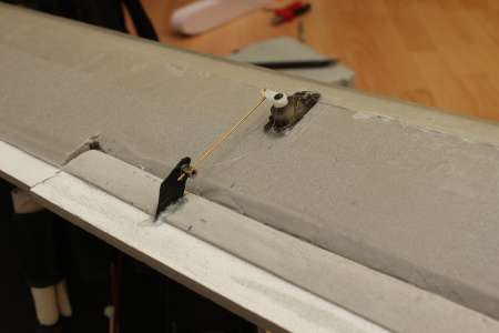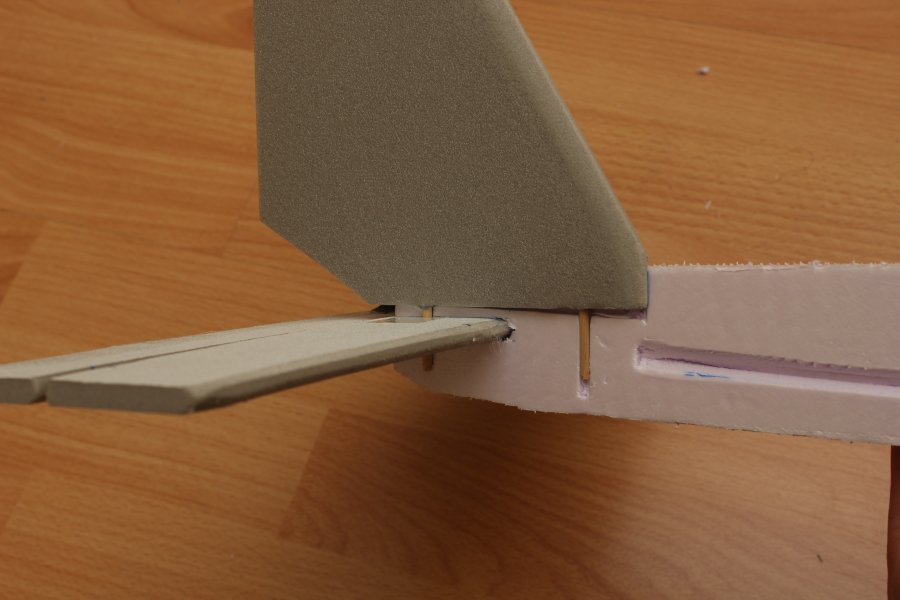 Die Verbindung zwischen Flügel und Rudern besteht aus Verpackungsfolie. Angeraut und mit Sekundenkleber in kleine Schlitze gesteckt hällt das echt gut und wackelt vorallem nicht. Selben "Trick" hab ich zuvor beim