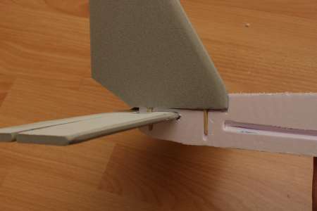 Höhen und Seitenruder werden hinten in den Rumpf reingesteckt. Das Seitenruder bleibt vorerst unbeweglich, ein Servo kann später immernoch nachgerüstet werden.