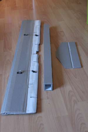 Zur Verstärkung hab ich zwei dünne Holzplatten an die Seiten angeklebt, da der Rumpf durch die Löcher an den Stellen doch etwas wabbelig war.