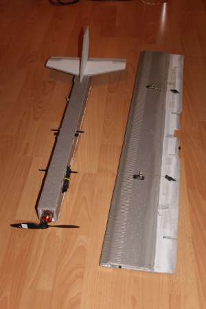 Dazu die einfachste Form eines Fluggerätes: Ein langer Quader als Rumpf, die Tragflächen mit Gummi oben drauf geklemmt und die ganze Elektronik innen verstaut.