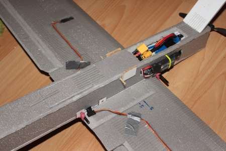 Im vorderen Teil befindet sich unter einer Klappe der 3S Lipo, 1000mAh bis 2200mAh passen gut rein und sind schwer genug, damit der Schwerpunkt bei gut 1/3 der Tragfläche liegt.