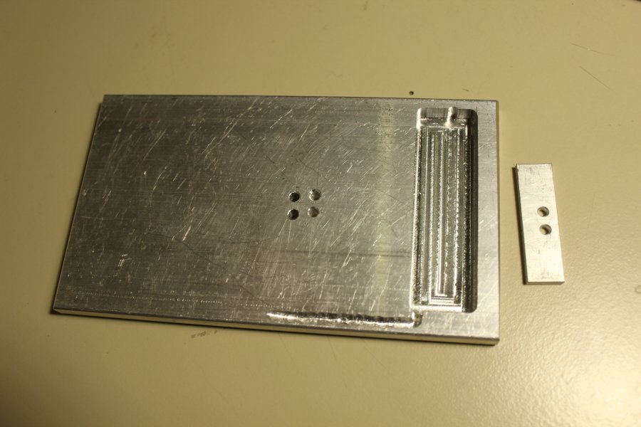 Als Basis für den Neubau diente eine mäßig dicke Aluminiumplatte. Ein nicht mehr ganz so frischer 600mAh 1S Lipo soll darin eingelassen werden. Mit der Fräse und einem 3mm Zweischneider hab ich die Tasche Stück für Stück ausgefräst.