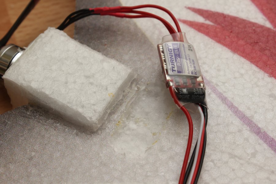 Turnigy Plush 12A ESC wird in eine Vertiefung direkt hinter dem Motorhalter versenkt und mit Kabelbinder festgezogen. Die Vertiefung hab ich mit einem Dremel und einem alten Abgebrochenen 3mm Bohrer herausgefräst.