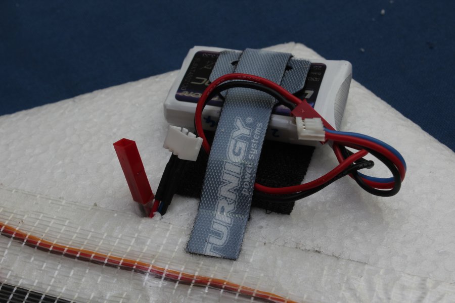 Auf der Unterseite soll eine Carbonflachstange den Wing etwas steifer machen. Der Kabelbinder des ESC ist praktischerweise über die Carbonstange geführt und hält diese somit zusätzlich zu dem Sekundenkleber fest.