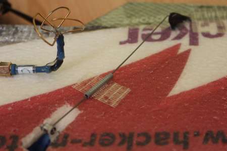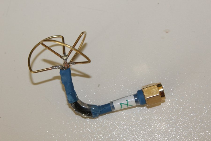 Der Videosender ist flach auf dem Wing montiert, die Antenne muss um gerade nach oben zu zeigen einen 90° Winkel haben. Dazu hab ich kurzerhand eine Cloverleaf Antenne mit RG174 Koaxialkabel gebastelt und nach oben gebogen. Der Heißkleber am Kabel hält die Antenne in der Position. Besser währe natürlich an dieser Stelle halbstarres Koaxkabel gewesen, hatte ich aber nicht da.