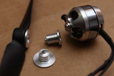 Da der Motor als Pusher den Flieger antreibt passen die Propeller nicht auf den eingebauten Propsaver. Die beiliegenden Propadapter helfen auch nicht weiter, da sie nur in eine Seite des Propellers passen, dieser aber anders herum montiert werden muss.