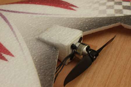 Der Motor wird dann auf die beiliegende Plastikplatte geschraubt, welche dann wiederum auf den EPP Block geklebt wird. Heißkleber hat bei EPP bis jetzt immer gut funktioniert, so auch hier.