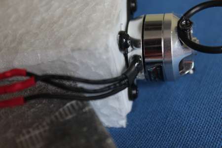 15:13 13.09.2014 Während die mit Uhu-Por benetzten Glasfaserklebebänder vor sich hin trocknen hab ich die Kabel vom Motor mit Epoxykleber zur Zugentlastung an selbigen verklebt.