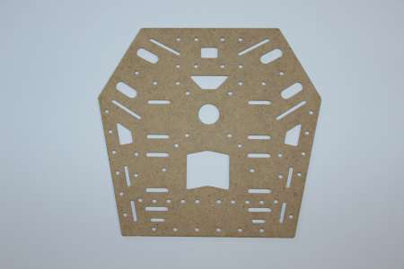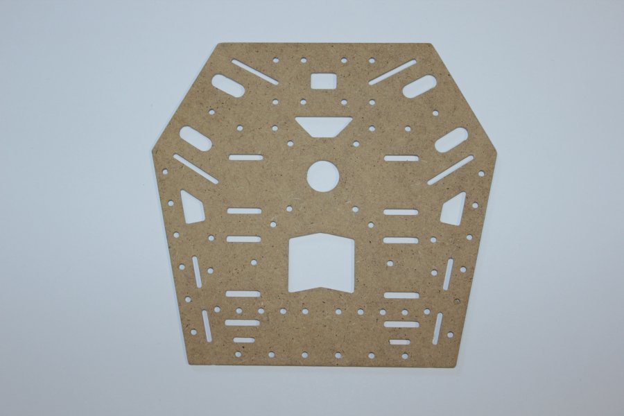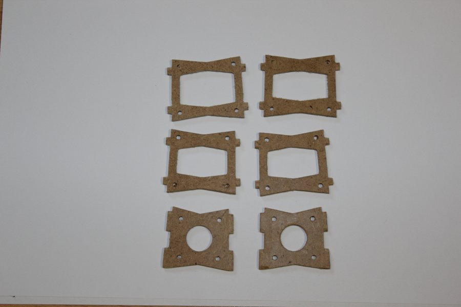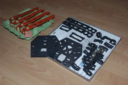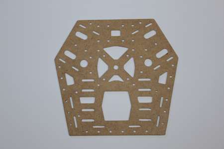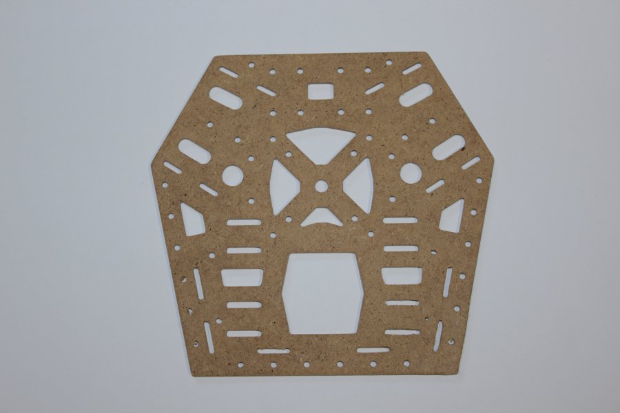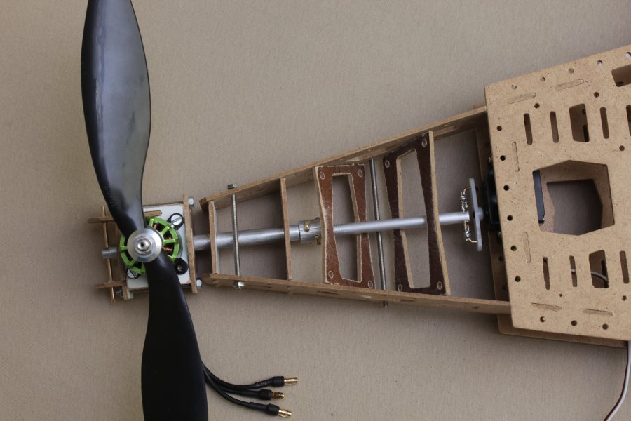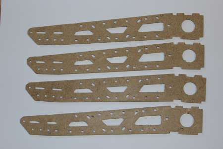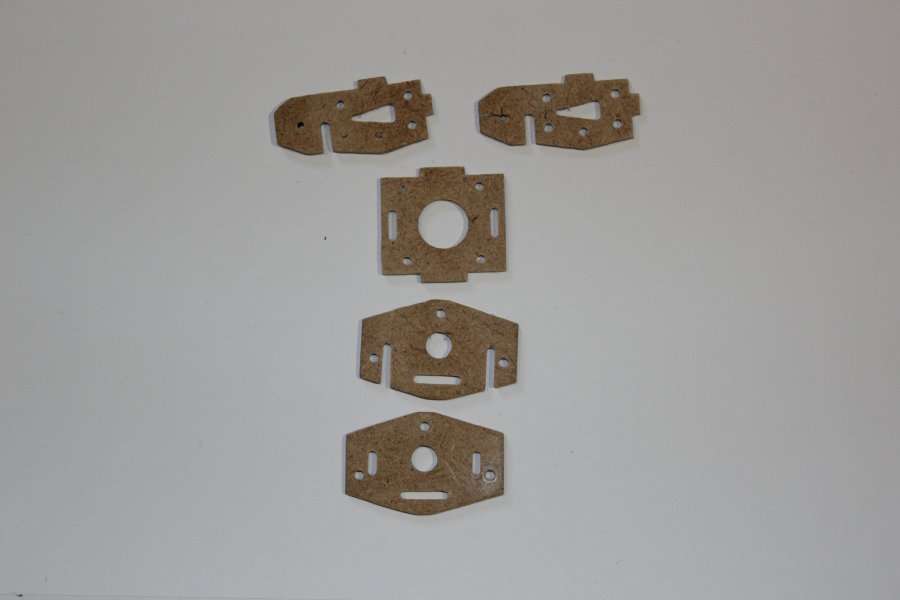 Der erste testgefräste Arm hielt selbst aus dem labberigen Pressholz durch das Zusammenstecken erstaunlich gut. Also hab ich den Rest weiter aus Holz gefräst, wenn er nicht beim ersten Flug auseinanderfällt lass ich ihn eventuel komplett aus Holz. Zum rumflippen und heizen ist er primär nicht gedacht.