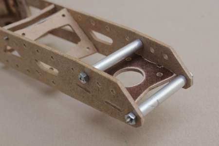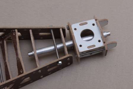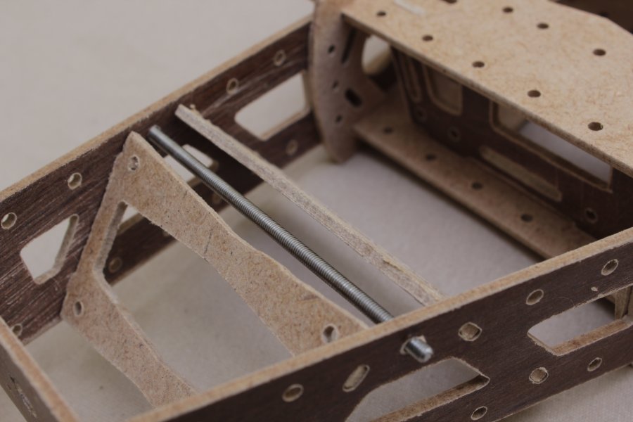 Die längste Gewindestange kommt an den hinteren Arm zwischen die beiden "Zwischenplatten".