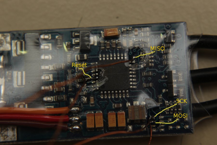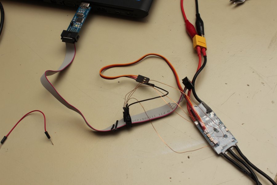 Desweiteren wird noch GND und 5V benötigt. Dazu hab ich ein Labornetzteil an das ESC angeschlossen (12V an den XT60) und beide Massen, also vom Netzteil und vom USBasp verbunden (über den Servostecker). Die 5V vom USBasp werden dann nicht benötigt.