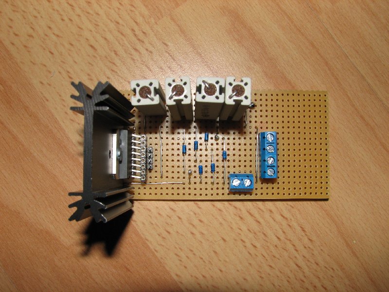 Als letztes noch nen fetten Kühlkörper mit Wärmeleitpaste am IC festschrauben. Das Teil wird auf Dauer richtig heiß, später kommt für längeren Betrieb noch nen aktiver Kühler in die Nähe.