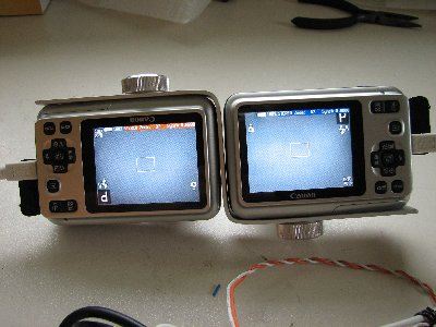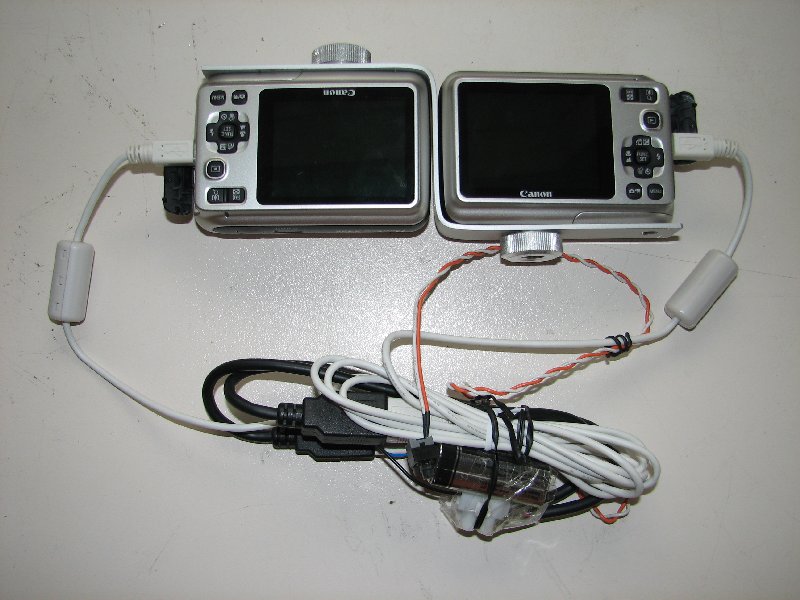 Hier sieht man meine Testapperatur (Der Kabelsalat). Auf knopfdruck bekommen beide Kameras am USB ungefähr 5V, wodurch sie auslösen.