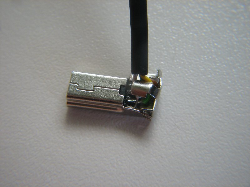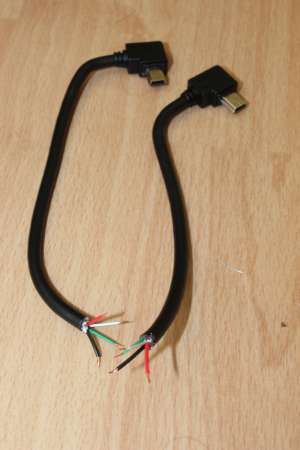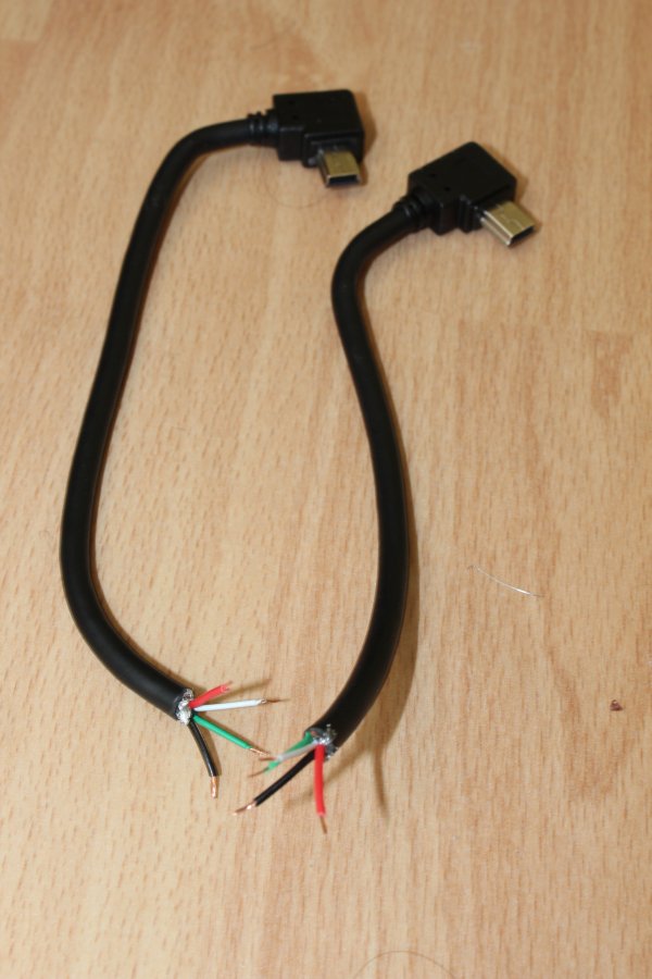 An die mini-USB Stecker dann jeweils ein kurzes 4 Adriges Kabel angelötet und das Ende irgendwie auf 90° gebogen