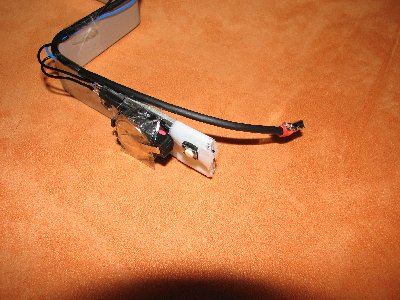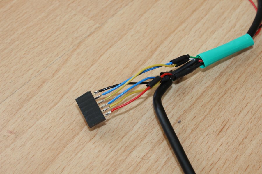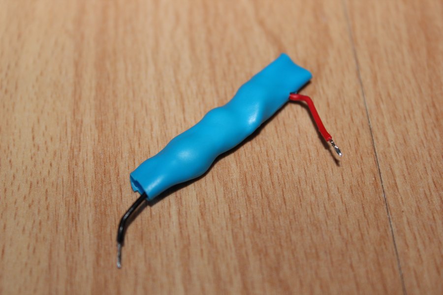 Dort mussten beide Kabel abgeschnitten werden um die für die Spannungsversorgung vorgesehenden Adern zu verbinden (hier Rot (+5V) und Schwarz (GND) ).
