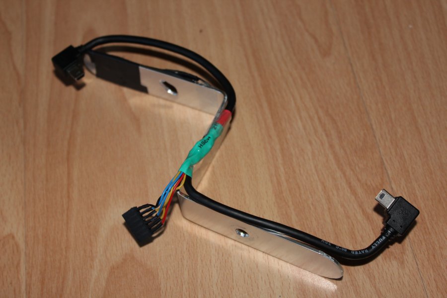 Das Aluminiumflachprofil hab ich im gleichen Zuge durch ein nicht eloxiertes, etwas breiteres (2.5cm) ersetzt. Zwei USB Kabel mit einem 90° Winkel an der Mini-USB Seite sollen die DIY Stecker ablösen.