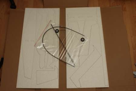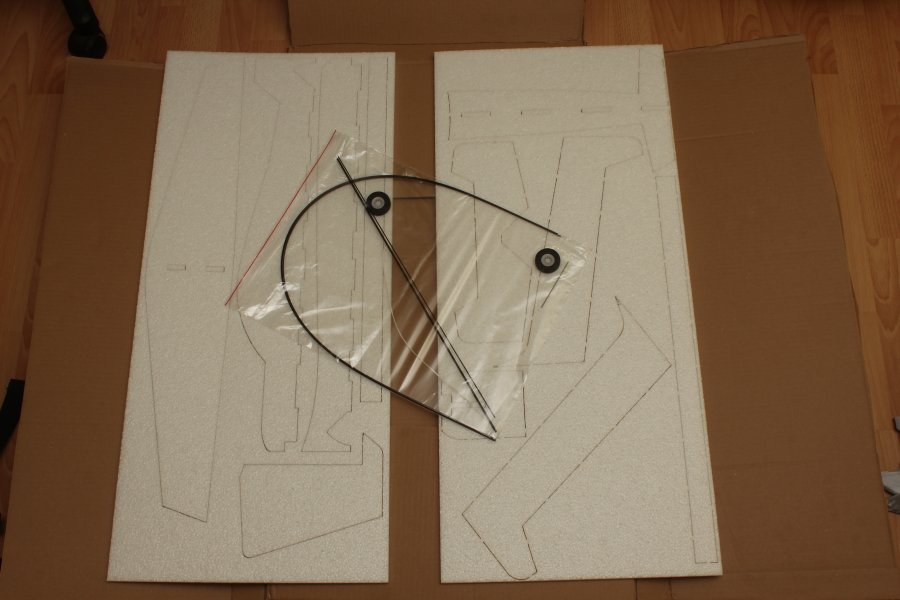 Hier zu sehen, alles was sich in dem Paket befand: zwei 390mm x 880mm große und 9mm dicke EPP Platten mit den Einzelteilen, sowie ein Beutel mit Carbonstangen (insgesammt 4,5m mit 1,6mm Dicke und 50cm in 2mm Dicke), Rovings zum verbinden zweier Carbonstangen und die Landeräder.