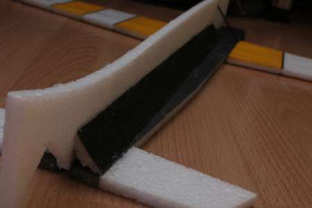 Nachdem die untere Rumpfhälfte mit den Tragflächen, Höhenleitwerksflossen sowie dem vorderen Rumpfteil verklebt waren (Hauptsächlich Uhu-Por, an den äßeren Kanten aber teilweise auch etwas Heißkleber) konnte die EPP Torsionsverstärkung (kein Depron wie in der Anleitung beschrieben) an beide Seiten mit Uhu-Por angeklebt werden. Etwas Heißkleber musste aber nachträglich doch noch dran, da sich die Teile an den Klebestellen selbst zu viel bewegen konnten, Uhu-Por eben.