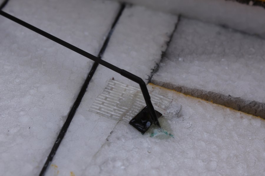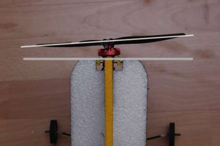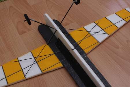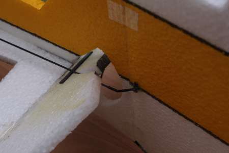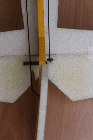 Die Anlenkungen an den Rudern bestehen jeweils aus einem 3cm langen 1,6mm Carbonstab, der mit Sekundenkleber in einem 45° Winkel in das EPP gestochen wurde. Davor ist ein 10mm langes Reststück Carbonflachstab angeklebt. Das ganze ist mit einem großzügigen Klecks Epoxykleber zusätzlich fixiert.