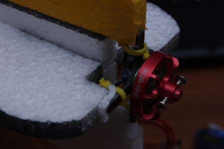 Zuerst den Motor (hier der Turnigy 3020 1800Kv). Da es nachher schwieriger ist den Schwerpunkt nach vorne zu verlagern als nach hinten, hab ich den Motor auch ans vorderste Ende angebracht. Um zudem aber Motorsturz, sowie Seitenzug verändern zu können ist der Motor an der CFK Befestigung nur mit Kabelbinder an einem dahinterliegenden Kreuz aus 1,6mm Carbonstangen festgemacht.