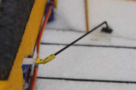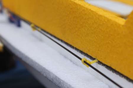 Selbst die kleinen 5g Servos müssen so weit wie möglich vorne eingebaut werden, dadurch werden die Anlenkstangen ebenfalls längen und können sich bei Belastung etwas biegen. Damit das nicht passiert sind werden die Carbonstangen über leicht angezogene Kabelbinder am Rumpf gehalten.